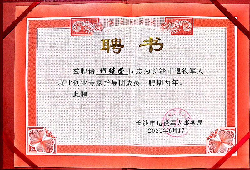 长沙退役军人事务局聘何继荣为专家指导团成员